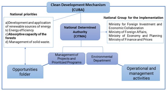Another possible approach is the scheme used for the implementation of the Clean Development Mechanism (CDM) in Cuba (Figure 3). It defines the functions and attributions of the National Determined Authority (NDA), the Center for the Management of Prioritized Projects and Programs and the National Group within the process of attention and implementation of the projects. By the provisions of the regulations, the NDA is responsible for authorizing the participation of specific entities in project activity for the CDM []. The approval of the project goes through a series of complex stages and requirements, which require consistent evidence of the contribution and correspondence of the project with the criteria of sustainable development in Cuba.