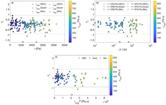Bacterial removal efficiency as a function of (a) the maximum and time-averaged shear stress; (b) the time during which the shear stress exceeded the critical values reported in Lange et al. [27] for cell damage and lysis; (c) the product of average shear stress and treatment time. The horizontal dashed lines represent the 95% confidence interval for the removal efficiency calculated from the confidence intervals for the Colilert Quanti-Tray 2000 assay. The color bars report the viscosity of the substrates.