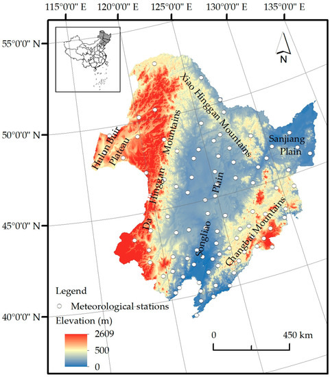 Northeast China is located at 115°05′–135°02′ E, and 38°40′ to 53°34′ N (Figure 1), with an area of 1.24 × 106 km2. In administrative divisions, it includes Liaoning, Jilin, Heilongjiang, and Inner Mongolia (eastern parts) Provinces. Northeast China belongs to the temperate continental monsoon climate region. The mean annual temperature is approximately 5.6 °C, and the annual precipitation varies from 240 to 1000 mm. Most of the region is located in humid and semi-humid areas, and some areas in the west are located in semiarid areas. Its topography has large fluctuations in space. According to the physical geographical characteristics, the Northeast can be divided into six parts, namely, Songliao Plain, Sanjiang Plain, Da Hinggan Mountains, Xiao Hinggan Mountains, Changbai Mountains, and Hulun Buir Plateau [33].