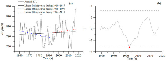 (a) Interannual variations of ET0 in Northeast China and (b) results of mutation detection in temporal variation in annual ET0 over Northeast China during 1960–2017 by Cramer’s test. The horizontal black lines are the 0.01 significance level line. The red point indicates the mutation year.