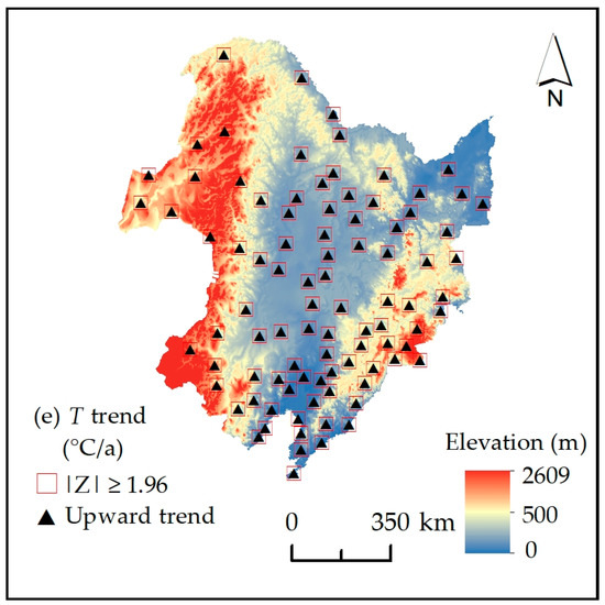 Spatial patterns of trends in ET0 (a), WS (b), RH (c), SD (d), and T (e) over Northeast China during the period of 1961–2017. The trends in stations with red squares were significant (p < 0.05).