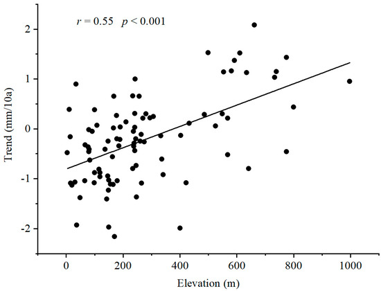 The spatial distributions of the various trends of ET0 and climatic variables in Northeast China during 1960–2017 were shown in Figure 4. The ET0 trend displayed obvious spatial heterogeneity. The meteorological stations that presented decreases were mainly located in low-altitude plain areas (<500 m), such as the Songliao Plain and Nenjiang Plain, and 74% of the stations at low elevations (<500 m) showed a negative trend, of which, 47% were significant (p < 0.05). Conversely, the stations with increasing ET0 trends were mostly distributed in high-altitude areas (>500 m), such as the Da Hinggan Mountains, Xiao Hinggan Mountains, Changbai Mountains, and Hulun Buir Plateau. Among the stations located at high altitudes (>500 m), the number of stations showing upward trends accounted for 84%, and 63% of them reached a significance level of 0.05. In summary, the variation trend of ET0 in Northeast China was affected by altitude. ET0 trend was significantly and positively related to altitude (p < 0.001) (Figure 5). From low altitude to high altitude, the changing trend of ET0 was from negative to positive, respectively. WS at most stations (92%) had downward trends in Northeast China. Furthermore, the majority of stations with stronger significant downward trends were located in low-altitude areas (<500 m), and 88% of the sites at this height level showed a significant decline in WS. In other words, there was a clear downward trend of WS at low altitudes (<500 m) in Northeast China during 1960–2017. Similar to the spatial pattern for WS, RH also displayed a downward trend integrally, with 78% of the stations showing a downward trend, of which 59% reached a significance level of 0.05. As for SD, stations with significant decreases in SD were mainly located on the Songliao Plain. Stations with an upward trend of SD were mainly located in the mountains area. T of the whole of Northeast China was on the rise, and all stations in this study area represented a significant upward trend (p < 0.05).