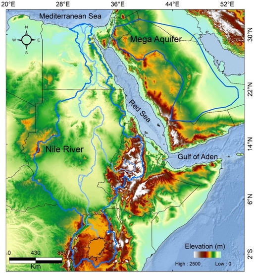 The study area represents the Nile River Basin in Africa and the Mega Aquifer in Asia (represented by blue polygons) shown on a topographic map.