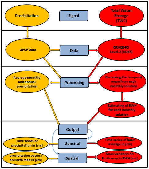 In the following, the GRACE-FO and precipitation data used in this study are presented in Section 2. Section 3 describes the methodology to estimate the TWS from the GRACE-FO level-2 products and the monthly precipitation from the GPCP data. In Section 4, the results in the spectral and spatial domains are discussed. Finally, a relevant conclusion is outlined in Section 5.