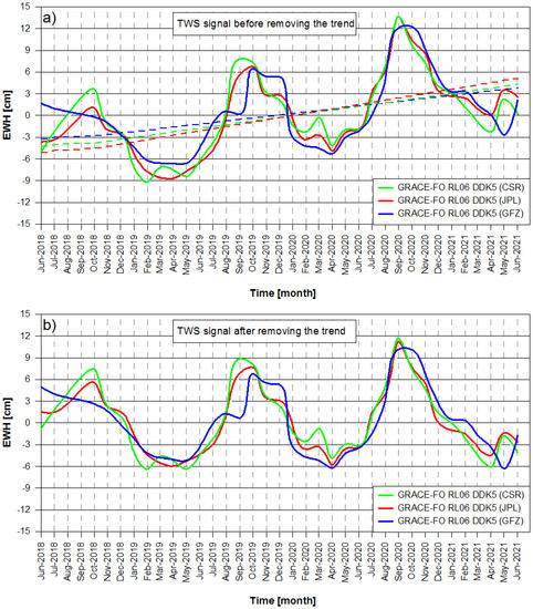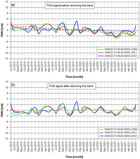 Mean basin average of the TWS signal in terms of EWH [in cm] over the NRB; (a) before and (b) after removing the trend (dashed lined) as derived from the DDK5 of GRACE-FO (RL06) products from the three official centers GFZ, CSR, and JPL.