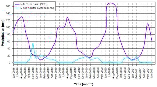 In this article, two large basins—the Nile River basin (NRB) in Africa and the Mega Aquifer system (MAS) in the Arabian region in Asia—have been selected to investigate the monthly and seasonal variabilities in the TWS in terms of the equivalent water heights (EWH) unit in order to quantify water shortages or water surpluses. Three years (from June 2018 to June 2021) from the sixth’s release of GRACE-FO (RL06) level-2 products (see Section 2) were used for this study. The precipitation pattern was also investigated over both basins for the same period using the GPCP data (Global Precipitation Climatology Project) to show the behavior of precipitation as a response to the mass changes in water storage.