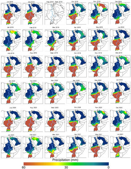 Figure 3 shows the EWH over the NRB as derived from the main GRACE-FO solutions (CSR, JPL and GFZ) with the DDK5 applied. There was general agreement between the three solutions over the NRB, with a large amplitude of the seasonal cycle (Average Amplitude: 12 cm). On the contrary, Figure 4 shows very low amplitude of the seasonal signal of EWH (Average Amplitude: 4 cm), where the well correlation between the three solutions continued to exist over the MAS. The precipitation over the NRB (Figure 6) was found to be the main driver of the high EWH amplitude. The peaks of the EWH time series were mainly dominated by the seasonal rainfall during the wet and dry seasons over the NRB as shown in Figure 3a. The higher peaks appeared between September and November and provided basin averages of about 30 mm, 60 mm, and 120 mm in 2018, 2019, and 2020, respectively. One should note here that these rates were affected by a positive trend of about 3 cm yr−1 during the investigated period. Figure 3b represents the monthly variabilities after removing the trend components for the whole studied period (from June 2018 to June 2021). This observed trend was due to the highly intensive rainfall (AAP: 1000–1800 mm yr−1) over the upstream countries in the southern and eastern parts of the NRB, which mainly occurs during the summer season (from June to August).