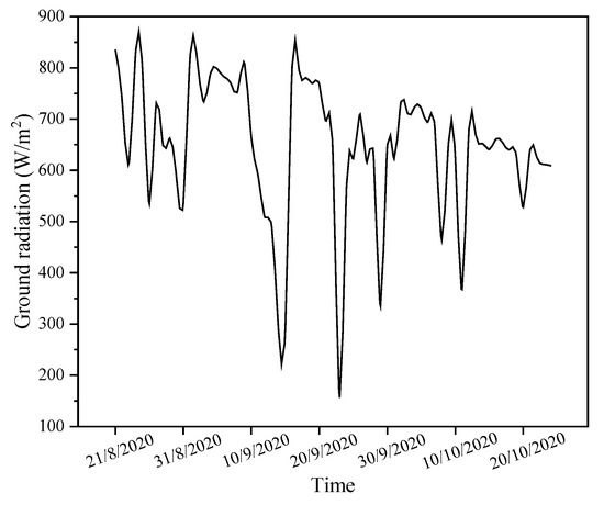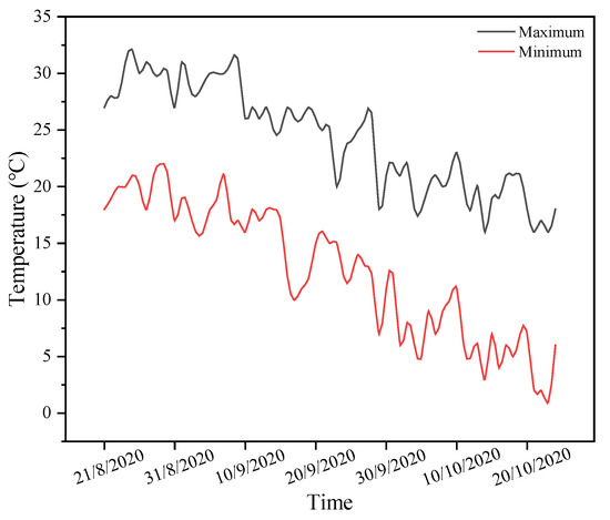 The rainfall data for Beijing over the last 30 years were statistically analyzed to determine the experimental water intake under each treatment in this study and the number of days between water intakes in each month. The field rainfall interval time was 12 h and when the rainfall interval exceeded 12 h, it was defined as two rainfall events. Rainfall of less than 2.0 mm was considered unproductive flow and was not included in the statistical analysis. There have been 317 relevant rainfalls in Beijing over the last 30 years from August to October, with the average number of days between rainfalls in August, September, and October being 6, 8, and 20 days, respectively (Table 2). As a result, this experiment was designed with three groups of inflow intervals. This experiment’s arrangements were as follows: 21 August 2020, 27 August 2020, 2 September 2020, 10 September 2020, 18 September 2020, 26 September 2020, 5 October 2020, 24 October 2020. The simulation experiment ended on 24 October 2020, but measurements of the physiological indicators continued after the end of the experiment. The temperature variation and the maximum radiation variation on the ground during the experiment are shown in Figure 1 and Figure 2, respectively, and the environmental variables remained the same throughout the experiment, except for the artificially set variables.