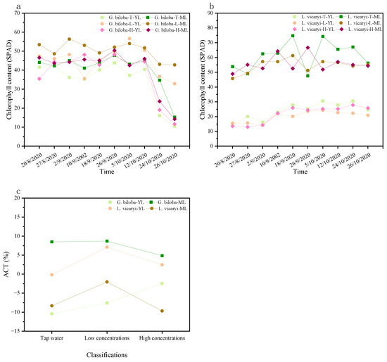 Changes in (a) Ginkgo biloba L. and (b) Ligustrum × vicaryi chlorophyll contents, n = 3; and (c) chlorophyll content ACT in the plants.