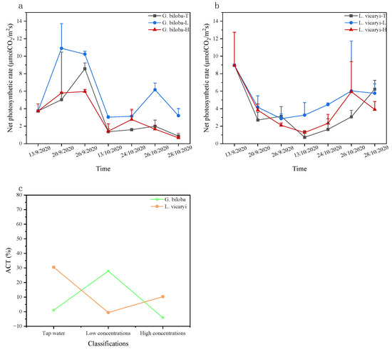 Changes in the (a) Ginkgo biloba L. and (b) Ligustrum × vicaryi net photosynthetic rates, error bar represented the measurement error of n leaf physiological index of the same plant, n = 3; and (c) ACT for the net photosynthetic rate.