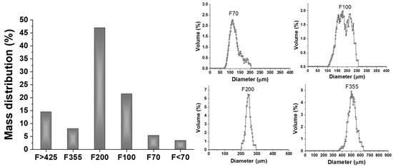 The polydisperse sand sample griddling resulted in six fractions collected on the sieves (F > 425, F355, F200, F100, F70, and F < 70), where the numbers represent the mesh size of each sieve. Before sieving, the sand microparticles were treated with NaOH and HCl to remove humic acids and carbonates. Discarding the extreme sized fractions (F > 425 and F < 70), a number of four fractions, which represented approximately 80% of the initial sand sample, were subsequently used to obtain the core/shell composites. The mass distribution of sand microparticles, as well as the size polydispersity, shown in Figure 1, was obtained by weighting the samples and by Morphologi G3SE analysis.