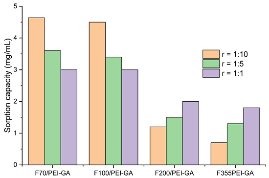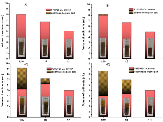 The degree of PEI cross-linking inside the shell is a significant parameter in the sorption/desorption of different types of pollutant molecules on the composite surfaces. Strong composite cross-linking (r = 1:1) will result in a PEI-GAr shell with a strong packing of the polymeric chains, with less accessibility for the pollutant molecules to the active sorption site, but with a higher density of the functional groups. Instead, low composite cross-linking degrees (r = 1:10) will create more flexible shells with fast accessibility towards active functional groups, but with lower stability of the organic architecture under environmental conditions. In this study, the amount of the composite shell which remained and surrounded each sand particle after deposition/cross-linking/extraction processes, was evaluated in swelling experiments by measuring the volume of sediments for each sand fraction (Figure 2).
