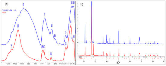 (a) FTIR spectra of and (b) XRD diffractograms of F100 (red) and F100/PEI-GA1:10 (blue) microparticles.