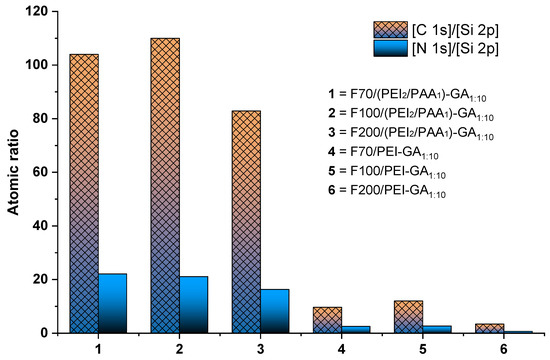 As shown in Figure 5, the atomic ratios decreased drastically after the acid-base extraction, compared with the values recorded before extraction. The decreases of non-cross-linked PEI and PAA content by multiple extraction/washing were smaller for composites with smaller cores (F70 and F100) than for the composites with the biggest core (F200), where the loss of non-cross-linked PEI and PAA chains was higher in the successive extraction/washing steps. Thus, the XPS measurements showed that the PEI-GAr composites contained smaller amounts of organic shells compared with the (PEI2/PAA1)-GAr ones, but with a more flexible PEI network around the sand particles and a higher number of functional groups that were more accessible to the pollutant molecules, such as copper ions and BCG molecules.