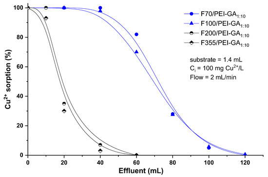 The column experiments on Cu2+ removal from aqueous solution (Ci = 100 mg/L) are presented in Figure 7. Using a peristaltic pump, the aqueous solution was introduced with a flow of 2.0 mL/min in a column filled with 1.4 mL sorbent.