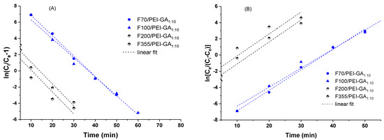 The linear fit in Figure 8 enables the calculation of the parameters of both models, with Equations (2) and (3), resumed in Table 3. The R-square values, in the domain 0.8871–0.9954, showed a good fit of both models with the experimental data.