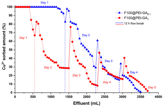 The amount of copper sorbed from an influent solution (CCu2+ = 2 mg/L) onto F100/PEI-GAr composites (r = 1:10 and 1:1) inside a column operated in a discontinuous mode (with 12 h break of flow before each run).