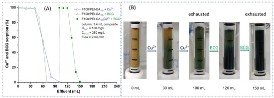 (A) Sorption efficiency of Cu2+ and BCG onto F100/PEI-GA1:5 from mono-component influent solution carried out in separated runs (empty symbols) and consecutive runs (full symbols), where BCG has been retained by the material exhausted in Cu2+; (B) Column images after different effluent volumes passed through.