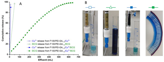 Desorption efficiency of Cu2+ and BCG from F100/PEI-GA1:5 loaded with single components (empty symbols) and bi-components (full symbols) (A) evaluated in dynamic conditions (2 mL/min) in a column (B).