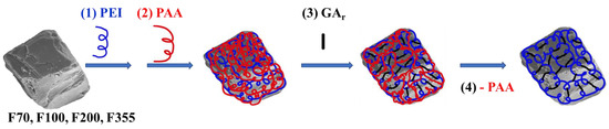 Using 10 mL of each sand fraction (F70, F100, F200, F355) mixed with 4.5 mL PEI solution (1 M) and 2.25 mL PAA solution (1 M, added drop-by-drop in the system), the following composites were obtained Fn/(PEI2/PAA1), n = 70, 100, 200, and 355. At the end of the deposition process, the (PEI2/PAA1) organic shell successfully adhered to the sand surface based on the stickiness property of the polyelectrolyte complex, mainly due to the PAA chains. Thus, each sand fraction was functionalized with the same amount of complex but differently distributed on the external surface of the particles, which is a function of the fraction’s average diameter. The amount of sand fraction and polyelectrolyte concentrations were kept constant in all depositions (steps 1 and 2 in Scheme 1), and only the particle sand diameters were different.