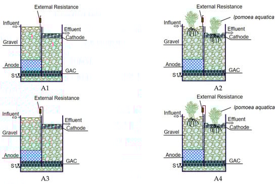 There are four coupled systems set up in this study. The coupled system was composed of a 50-cm-tall polyacrylic plastic box with a rectangular cross-section of 40 cm × 20 cm, as shown in Figure 1. To improve the effects of the system on the anaerobic and aerobic environment as well as the redox gradient, the reactor was divided into downflow and upflow regions by polyacrylic plastic; the bottom 5 cm was left unblocked. The water inlet was above the downflow region. The influent first arrived in the downflow area, passed the anode region, moved through the bottom to the upflow area, and finally arrived at the cathode region. The anode adopted a stainless-steel wire mesh to wrap the activated carbon particles in (20 cm × 20 cm × 10 cm) that was buried in the downflow area (10–20 cm from the bottom), complying with the anodic conditions of the MFC, which was in an anaerobic condition []. Carbon felt was used as the cathode (20 cm × 20 cm) and arranged on the upflow surface. It could be combined with plant roots and contact with the air to promote oxygen transport and diffusion to create better aerobic conditions. This layer supplied sufficient support for anaerobic heterotrophic bacteria, which continuously degraded organic compounds remaining after the anodic removal. An activated carbon layer was set 5 cm above the bottom in both the downflow and upflow regions. The stainless-steel screen mesh, the carbon felt and the metal titanium wires were used to connect the anode and cathode with an external resistance of 800 Ω to complete the circuit. The exposed area of wire was then covered with water-proof nonconductive epoxy to insulate it. The activated carbon layer acted as a temporary carbon source. Some organic matter was fixed by the activated carbon absorbing. This process reduced the number of organic compounds reaching the cathode. A sampling port was located at anode that was 10 cm above the bottom. The Ipomoea aquatica was planted in this study. The effective volume of the whole container was 11.5 L, while the whole volume was 37.8 L. The orthogonal experiments were shown in Table 1. The structures of coupled systems were shown in Figure 1.