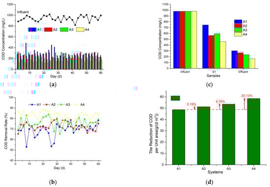 By comparing the removal amounts of COD per unit area daily with A1 to assess the COD improvement of A2, A3 and A4 systems, it was found that the amounts increased to 2.53 g·(d·m2)−1, 4.76 g·(d·m2)−1 and 9.81 g·(d·m2)−1, respectively. Moreover, the sum of the increase in the amount of A2 and A3 (i.e., 7.29 g·(d·m2)−1) was lower than the increase in the amount of A4 (9.81 g·(d·m2)−1). The better coupling performance was verified in this study. A4 had achieved the synergistic reaction of plants and the closed circuit simultaneously, which was higher than the sum of a single coupled condition of plants or the closed circuit. Thus, the ability of A4 to perform COD removal was more determined.