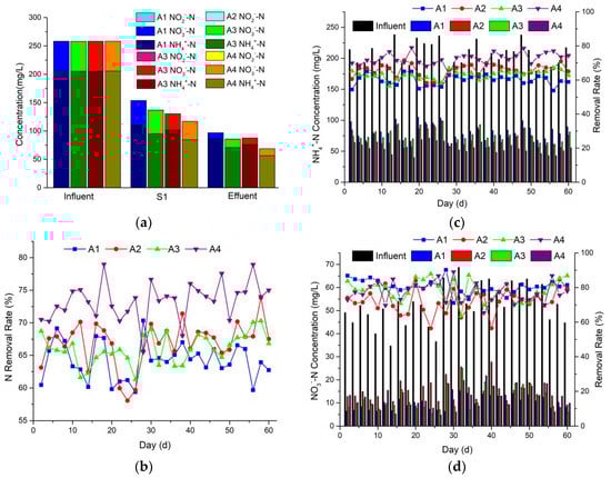 (a) The amount concentrations of NH4+−N, NO3−-N and NO2−-N along the water flow; (b) The N remove rates of A1, A2, A3 and A4; (c) The NH4+-N concentrations and remove rates of A1, A2, A3 and A4; (d) The NO3−-N concentrations and remove rates of A1, A2, A3 and A4.