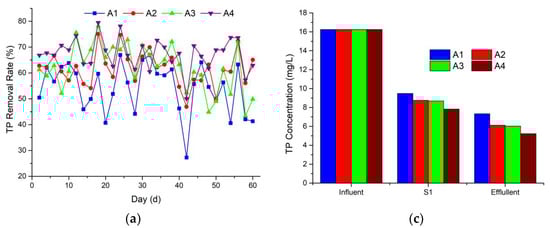 (a) The TP remove rates of A1, A2, A3 and A4; (b) The concentrations of the influent and effluent of A1, A2, A3 and A4; (c) The TP concentrations along the water flow.