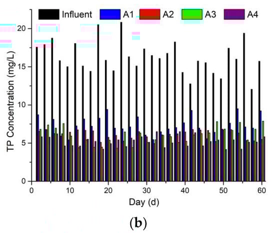 In the CW-MFC coupled system, the mechanism of P removal was the adsorption of the surface chemistry of the conductive materials. As shown in Figure 4a, the P removal rates of A1, A2, A3 and A4 were 55.48%, 62.32%, 62.87% and 67.86%, respectively. The removal rates of A2 and A3 were similar, which meant that planting plants or the closed circuit in the system can have similar effects regarding P removal, and both can result in better impacts. In A2, the roots were distributed into the substrate, forming an interception net. On the one hand, P was absorbed as nutrients. On the other hand, the roots provided an appropriate attachment site for microorganisms, promoting microbial growth and enhancing P resorption. In A3, the electrode was rich in microbes, and microbial growth and reproduction also improved the absorption and use of P. In A4, the synergistic effect of plants and electricity production in the CW, the plant absorption, the microbial absorption and adsorption and the electrode surface adsorption were optimised to enhance the removal of P. Figure 4c shows the comparison of P concentrations in the influent, the anode area (S1) and the effluent. Moreover, more P was removed in the wastewater downflow area. In A1, the amount of P removed in the downflow area was less than the other three systems. However, in the upflow area, the P removal amount in A1, A2, A3 and A4 was similar and less than the downflow area, respectively. The differences of the TP per unit area reductions of A1, A2, A3 and A4 were shown in the Figure S2. It could be inferred that P was mainly cut in the downflow area, and the absorption effect of the anode on P was significant. Zhao [] had found that Dechloromonas and Tetrasphaera could remove phosphorus via the denitrifying phosphorus removal and fermentation phosphorus removal pathways, respectively. With the continuous and stable system operation, the electric generating voltage as well as the redox potential around the anode gradually rose steadily. Moreover, some metal hydroxides which were susceptible to the redox potential in the swine wastewater changed. For example, Fe2+ was oxidised to Fe3+ to precipitate, and the colloid formed by Fe3+ had better stability and specific surface area, thus making P in the wastewater tend to stabilise, constantly being intercepted and accumulated in the substrate. It could be inferred that the closed circuit in CWs might promote the migration of P from the wastewater to the substrate and microorganism. In other words, this system concentrated and retrieved P in the substrate as fertilisers in the reused way. Therefore, P can be used as a fertiliser in crop production but not the algal blooms [].