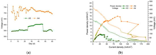 In this study, the maximum CEs of A3 and A4 were 0.1585% and 0.1704%, which were much lower than the single MFC system because the electrons produced in the CW-MFC system were not only used to generate voltage into the closed circuit but were also used elsewhere, such as for the degradation of pollutants. The electrons passed through other microconnections to avoid external circuits, or anaerobic bacteria, the competition at the anode []. Due to the large numbers of structural differences of CW-MFC studied by different scholars, and since the polarisation curve can avoid the volume effect and characterise the electrical production performance of the system, the maximum power densities of A3 and A4 were found to be 4.59 mW/m3 and 15.87 mW/m3, respectively. Moreover, the A4 showed obvious advantages, and the promotion of plant planting on the CW-MFC system was once again verified.