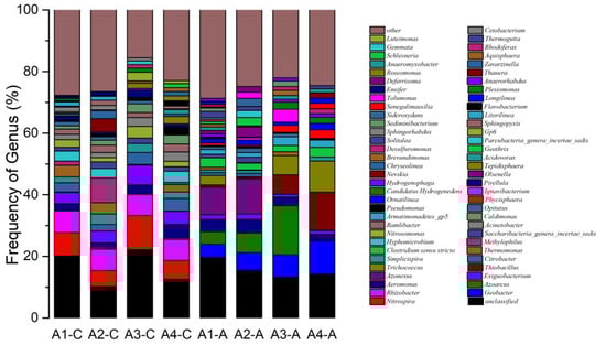 In Kumar’s [] earlier studies, the nanowire of Geobacter was composed of a series of small molecular weight structural proteins, in which the more conserved n-terminal formed the α-helix region, and protein–protein interactions constituted the core area of hydrophobic pilus fibres. Under the influence of hydrophobic forces, it is conducive to its adhesion on the surface of the electrode material. Even when the bacteria were not attached to the electrode surface, one end of the biological nanowires was connected to the outer membrane, and the other end was connected to the anode surface or other cells, hence achieving the transfer of electrons from cell to electrode and from cell to cell. Biological nanowires could get rid of the limitation of bacterium directly attaching to the surface of the electrode and could also form a ‘nano-power grid’ between cells to realise the transfer of electrons in the system []. Geobacter is a highly efficient electric-producing bacteria in MFCs as a microbial catalyst that was critical both in promoting electron production and in electron transport. Therefore, the relative abundance of Geobacter in the anode microbial flora of MFCs had a great influence on the effect of electricity production []. Usually, the higher the relative abundance of Geobacter, the better the effect of electricity production. In addition, Aeromonas, with its electrical production characteristics, has a higher abundance of the closed circuit system in the cathode than the anode and a higher abundance of the open circuit system on the anode []. It was also found that the bacterial genera with higher abundance of electrical production characteristics include Pseudomonas and Desulfuromonas, with higher abundance in the closed circuit system (A3 and A4) than in open circuit system (A1 and A2). In terms of the contaminant removal function, the other bacterial genera with higher abundance in the samples include Nitrospira, Rhizobacter, Azoarcus, Exiguobacterium, Aareaxus and Thiobacillus, among others. Nitrospira was only present in the aerobic area to oxidise NO2−-N to NO3−-N. Based on the nitrification–denitrification and denitrogen pathway, which provided a N source for the denitrification group, A3 had the highest cathode Nitrospira abundance (11.08%) and the lowest NO2−-N concentration (0.021 mg/L), verifying the characteristics of Nitrospira consumption of NO2−-N. Results of analysis of N in swine wastewater showed that the concentration of NH4+-N decreased in different systems. The decrease of N in the closed circuit system was higher than the open circuit system. Combined with microbial analysis, the abundances of Candidatus Hydrogenedens with anaerobic oxidation function on the anodes in the closed circuit group (A3 and A4) amount to 2.32% and 1.95%, respectively, which was about ten times that of the open circuit system. In the anode area, the wastewater carried the unoxidised NH4+-N and the NO2−-N obtained by NH4+-N oxide in the early stage, significantly reducing the amount of nitrogen pollutants in the system after the anaerobic ammonia oxidation process in the anodes. The accumulation of NO2−-N in the open circuit system (A1 and A2) was more severe due to the lack of anaerobic ammonia-oxidising bacteria. There was also speculation about the reduction of N in the anode, in which the microorganisms that exist in the electrode used other ways or shortcuts to convert N into gas while also reducing the amount of mud produced by the system, avoiding the blockage caused by many microorganisms and directly improving the service life of the wetland system.