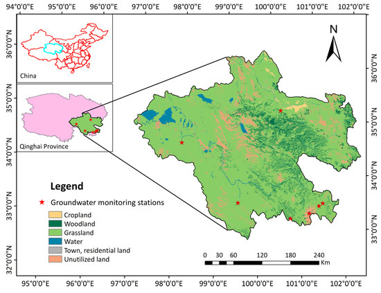 The Yellow River is known as China’s “Mother River”. The source region of the Yellow River is the most significant runoff-producing area in the Yellow River. The source region of the Yellow River plays an essential role in the entire Yellow River basin. The geographical location of the region is relatively unique, and the water resources of the region can respond positively to global climate change and serve as a climate regulator for China and even East Asia. The total area of the source region of the Yellow River is about 121,972 km2, among which the total length of the main channel reaches 1553 km. The annual average flow is about 20 billion m3, and the water flow in the source region of the Yellow River accounts for about 38% of the whole Yellow River Basin [37]. The source region is in the northeast of the Tibetan Plateau, with a longitude and latitude of 32°09′~36°34′ N, 95°54′~103°24′ E. The source region belongs to the typical plateau continental climate; the mean sea wave is 4300 m; sunshine hours and radiation are strong; the average temperature is −4.0~5.0 °C. The annual precipitation distribution is uniformed; the average annual precipitation has been between 220 and 780mm for many years; it has a gradual increasing trend from the northwest to southeast region. In recent years, the source region of the Yellow River has been affected by geological processes such as plateau uplift and under-river erosion, resulting in serious fragmentation of water-bearing basins in the source area. The capacity of the entire aquifer to regulate and store water is weakened, resulting in the gradual reduction in groundwater and the deterioration of water quality. The source region of the Yellow River is rich in frozen soil resources, 70.6% of which are covered by permafrost. However, with the development of cities and overgrazing by herdsmen in recent years, as well as global climate change, meadows, wetland and other especially frozen soil resources in this region have degraded to a certain extent. These lead to changes in the underlying surface such as the shrinkage of marshes and the expansion of desertification, contributing to the further degradation of permafrost and the pollution of sewage in the interior of the region. The bedrock strata in this area are mainly Permian, Triassic sandstone, and SLATE intercalated with limestone. The Quaternary strata are mainly composed of ice bonds and ice water facies deposits of the Middle Pleistocene and Upper Pleistocene, and lacustrine strata of the Lower Pleistocene and alluvial, diluvial, aeolian and swamp deposits of the Holocene. Due to the wide distribution of freezing–thawing zones, the permafrost layer plays a role of water isolation. Thereby, the groundwater is mainly divided into water above the frozen layer, water between the frozen layer and water under the frozen layer. The source region of the Yellow River is also a very important protected area in China, with rich biodiversity and ecological functions such as water conservation and climate regulation. If the groundwater quality in the area becomes poor, it will cause the loss of ecosystem service function and further deterioration of the ecological environment. The source region of the Yellow River can be divided into three sub-basins: Tangnai River, Maqu River and Jimaizi River basin. Therefore, seven groundwater-monitoring points representing the groundwater quality of the whole source area have been set up to measure the main runoff of the three sub-basins of the source area. According to the Chinese national standard “Technical Specification for Groundwater Environmental Monitoring” (No. HJ/T 164-2004), from January 2016 to November 2020, shallow groundwater with obvious groundwater distribution was collected in the dry season, normal season, and wet season every year. Groundwater monitoring points in the source region of the Yellow River are shown in Figure 1 and Table 1.