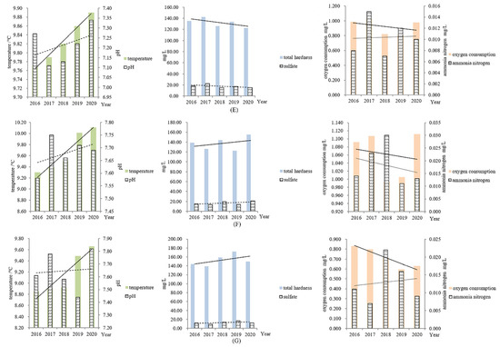 Figure 4A shows the first groundwater area at Tong De junction of 101 provincial highway. There is an overall increasing trend in temperature, total hardness (Th), sulfate, oxygen consumption (CODMn), and ammonia nitrogen levels from 2016 to 2020. An overall increasing trend was found for temperature, Th, sulfate, and NH4+-N levels. The maximum values of Th, CODMn and NH4+-N were observed in 2019. The interannual variation in pH decreased and groundwater was generally weakly alkaline. The water quality in the area was slightly worse in 2019 compared to other years. For the second groundwater area at Tong De junction of 101 provincial highway (Figure 4B), the temperature, pH, CODMn, and NH4+-N showed a clear upward trend. Th and sulfate fluctuated over five years, but there was no obvious trend of change. For the first groundwater area at the head of LuanShitou, the values of temperature, pH, CODMn, and NH4+-N showed significant interannual variations and substantial increases. Temperature, CODMn, and NH4+-N were at their highest in 2020—10.41 °C, 1.245 mg/L, and 0.026 mg/L, respectively (Figure 4C). The interannual variation of the temperature and pH of the groundwater at the mouth of the second groundwater area at the head of LuanShitou showed an increasing trend, with the temperature reaching the maximum value of 9.73 °C in 2020, while the rest of the indexes decreased, with the sulfate content showing a smaller decreasing trend (Figure 4D). The groundwater quality indicators of Laodeang Township had increasing interannual change indicators—temperature, pH and NH4+-N, with both temperature and pH having maximum values in 2020. The water quality indicators that decreased are Th, CODMn and sulfate, with the minimum values of Th and sulfate, respectively, being 138.92 mg/L and 15.44 mg/L in 2020 (Figure 4E). The temperature, pH, and Th of the groundwater in WoSai township increased significantly from 2016 to 2020. Temperature and Th were at their maximum in 2020, at 10.11 °C and 155.35 mg/L, respectively. The values of CODMn and NH4+-N showed decreasing trends (Figure 4F). The groundwater in the southern part of XingXinghai river had significant interannual variations in temperature, pH, Th and NH4+-N. The maximum temperature in 2020 was 9.66 °C, and the minimum temperature in 2016 was 8.85 °C. The maximum pH value was 7.78 in 2017, maximum Th value was 172.16 mg/L in 2019, and the lowest value was 139.21 mg/L in 2017. While there was a clear trend of interannual variation in sulfate, CODMn levels showed a decreasing trend over the five years of water quality monitoring and were at their minimum value in 2019 (Figure 4G).