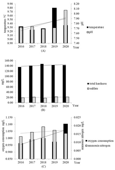 Interannual variation of groundwater in the source region of the Yellow River. (A) Temperature and pH. (B) Total hardness and sulfate. (C) Ammonia nitrogen and oxygen consumption.