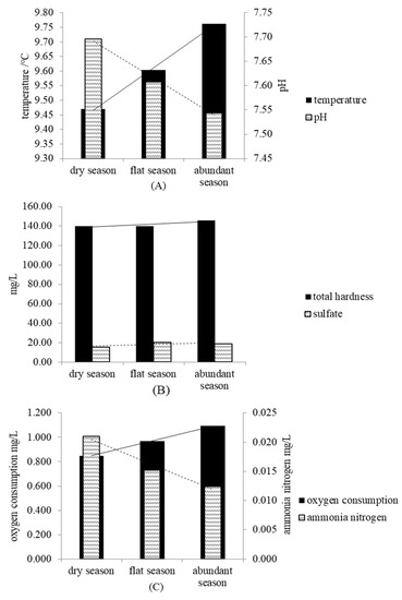 Annual variation of groundwater in the source region of the Yellow River. (A) Temperature and pH. (B) Total hardness and sulfate variation. (C) Ammonia nitrogen and oxygen consumption.