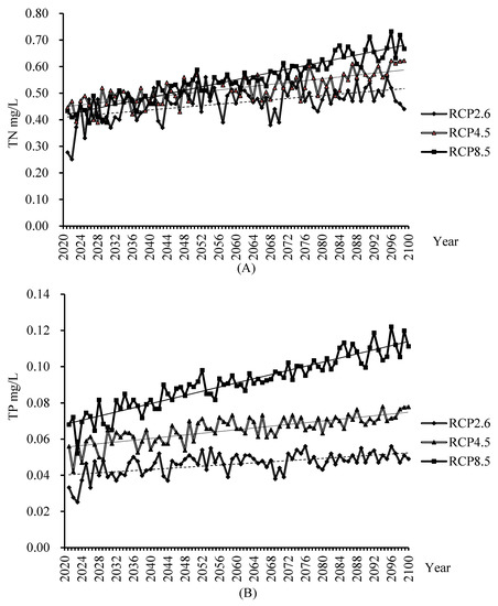 Under the three RCPs climate change scenarios, the interannual variation of TN and TP contents in the source region showed an increasing trend. The relationship between the simulated TN and TP increase rates under the three scenarios were all RCP 8.5 > RCP 4.5 > RCP 2.6, and the interannual difference in content among the three scenarios increases with the passage of time. According to Figure 8A, the future TN content had a small change, which is mainly characterized by interannual oscillations under the RCP 2.6 climate scenario. The future TN content was increased in the first and mid-century obviously and fluctuated less at the end under the RCP 4.5 climate scenario. Under the RCP 8.5 climate scenario, the future TN content showed obvious linear growth throughout the 21st century, and the fluctuations are relatively uniform. According to Figure 8B, the future TP content fluctuated greatly early on in the century and changed less at the end of century under the RCP 2.6 climate scenario. Under the RCP 4.5 climate scenario, the future TP content changed similarly to RCP 2.6. The future TP content of the source region was increased significantly in the early and late 21st century, and only slowly decreased in the middle of this century under the RCP 8.5 climate scenario.