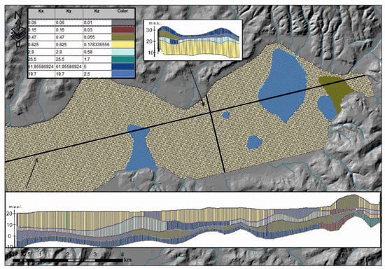The model domain is shown in Figure 4. The space has been discretized by 108 rows and 291 columns with cells of 50 × 50 m and four layers for a total of 125,712 cells, of which 81,856 are active. The thickness of the cells varies according to the geometry of the geological model (Figure 4). Specifically, the first layer is mainly representative of the horizon defined in the reconstruction as an aquitard/aquiclude; the second and fourth layers are representative of the shallower and deeper aquifers, respectively; the third layer was implemented to represent the impermeable interlayer separating the two main aquifers when present. The assigned hydraulic conductivity is also shown in Figure 4.