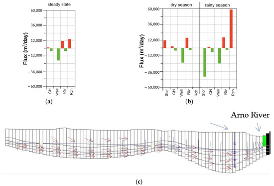 Water balance for (a) steady-state and (b) transient-state models in the dry and rainy seasons, and (c) section with flow line of the Empoli aquifer (for the section trace see Figure 5; CH: constant head, Riv: river, Rch: recharge).