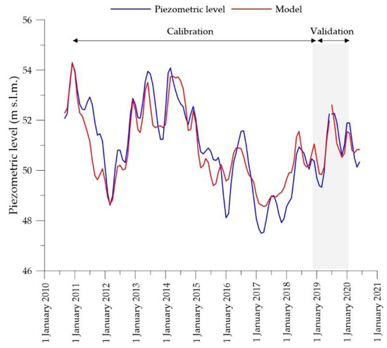 The results of the calibrated steady-state model are shown in Figure 6a,b, whereas in the diagrams of Figure 6c,d, it is possible to observe the variations over time of the experimental piezometric levels in comparison to the level evolution simulated with the transient-state model in selected monitoring points during the calibration and validation periods.