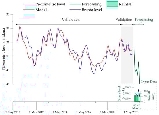 The Brenta River’s aquifer system is extensive, strategic for water supply, and characterized by inhomogeneity in terms of hydrogeology, recharge components, and water exploitation distribution as well. In these conditions, it becomes important to provide models able to describe the local groundwater behavior over time. This is the case of the data-driven model developed for a significant piezometric monitoring point sited near the losing River Brenta. The groundwater level evolution has been well-reproduced, starting from precipitation and hydrometric data as input. The equation describing the model confirms the close dependence of groundwater from the river in the analyzed zone and, therefore, the high sensitivity of the aquifer with respect to the meteo-climate regime, which directly and abruptly affects the regime of the River Brenta. In view of this high sensitivity, the forecast of groundwater level evolution under a relatively dry period of six months, similar to what occurred during the 2022 and 2003 years, was performed. Results point out a drawdown of groundwater level of more than 3 m (Figure 12) in a few months, thus remarking the very high sensitivity of the aquifer to climate extremes, as well as the need to plan actions for mitigating risks for water supply, given the regional importance of the wellfields present in this zone. Given the straight dependence of the local groundwater quantity from the hydrometric level, an advantage in making available a model that an equation estimates, such as a relationship, is the possibility of solving the same equation for a set of minimum progressive hydrometric levels with respect to when the piezometric levels do not decrease under safety threshold values. In this way, a water manager can provide actions over the catchment for maintaining the hydrometric levels over certain critical values once the territory dotes specific hydro-infrastructures able to regulate the dynamics of the watercourse.
