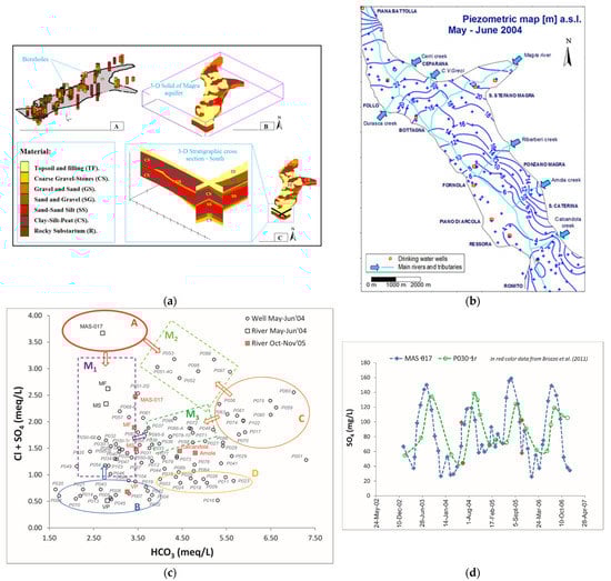 For what concerns the aquifer of the River Magra Lower Valley, here a combined approach of modeling has been proposed in order to obtain more efficient information through the developed model. Indeed, the aquifer system is well-described by means of data from geology, hydrogeology and geochemistry, enough to develop a process-based model able to reproduce the overall behavior of the system for groundwater quantity and quality. At the same time, and as the same process-based calibrated models confirm, the groundwater flow and transport deeply depend on some boundary conditions very sensitive to the hydro-climate regime, such as the River Magra. In these situations, to provide hypothetic sets of data for such boundaries (e.g., streamwater level or streamwater chemical concentration) in case of forecasting by a process-based model can be a real risk of failure, given the probable incongruence between such input data and the input data concerning the diffuse recharge directly deducible from the anticipated climate condition. In this kind of context, it is therefore evident that the use of a data-driven model able to link the evolution of certain boundary conditions with the anticipated climate conditions represents a significant advantage in terms of the efficiency and reliability of the predictive model. The so-developed model for the River Magra aquifer demonstrates that, under relatively dry climate conditions, the river is responsible for a relative worsening of the water quality, mainly tied to an increase or a relatively high and constant value of sulphate in groundwater. The dry weather results in a sort of persistent base flow in the River Magra, which is mainly dependent on the mountain thermal springs with sulphate chemical facies. The losing character of the river and the general groundwater flow path network promote the diffusion of such sulphate components into the aquifer for an extensive sector (Figure 18).