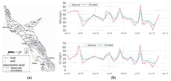 Calibration of flow and transport model: (a) Observed and simulated piezometric head [60] (b) SO4 and Cl observed and simulated value at their respective time (2004–2011) [60].