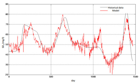 In Figure 16, a good agreement between modeled and real data (in this case, groundwater SO4 concentration in the River Magra) is shown, derived by the application of the data-driven model for the calibration period 2004–2011.