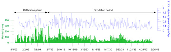 Rainfall and Magra hydrometric level for the calibration period (2004–2011) and forecasting simulation period (2012–2042).