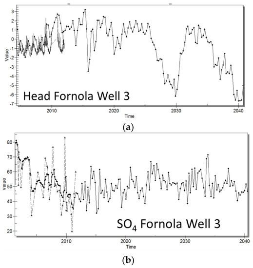Based on such hypothetic scenarios, an experimental and exemplified run of the flow-transport model for 30 years ahead was performed. In Figure 18, it is possible to observe an SO4 concentration map of the aquifer and SO4 time series of specific points. From the map, the strong chemical influence of the River Magra waters on groundwater quality is evident, especially close to Fornola wellfield, which attracts even more surface water. This influence can also be observed at the two representative points of the aquifer outside the wellfield (Figure 18), where a variation in the concentration of sulphates can be observed, mainly linked to the rainfall regime, especially at the point closest to the wellfield. It is interesting to observe how the sulphate value at the point located furthest from the wellfield remains higher and approximately constant over time following dry periods.
