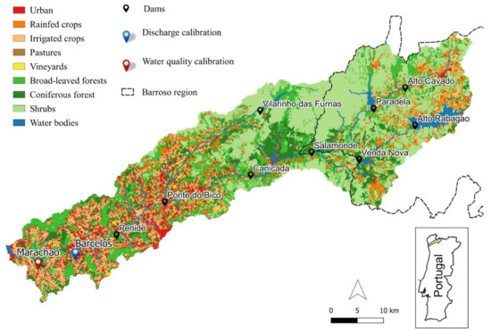 Location of the study area in the Cávado River Basin, land cover [21], calibration sites, and dams (SNIRH).