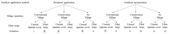 We examined the effect of 2 fertilizer application methods (broadcast application and fertilizer incorporation), 3 tillage operations (conventional, conservation, and no tillage), and the implementation or not of filter strips to reduce sediments, nitrate, and phosphorous export (Figure 2). The scenarios combined the different sustainable agricultural practices to test individual and combined effects of SAPs, resulting in a total of 12 scenarios (Figure 2).