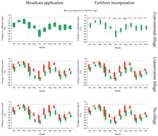 Percentage of change in monthly average sediment export under different sustainable agricultural practices. Percentage of change regarding the baseline scenario, with a broadcast application of fertilizer, conventional tillage, and current riparian cover (i.e., no filter strips).