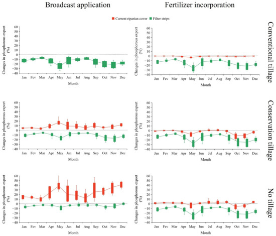 Percentage of change in monthly average phosphorous export under different sustainable agricultural practices. Percentage of change regarding the baseline scenario, with broadcast application of fertilizer, conventional tillage, and current riparian cover (i.e., no filter strips).