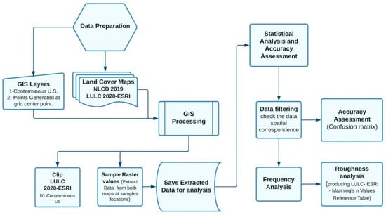 There are two main purposes of this research. The first is to assess the accuracy of the LULC 2020-ESRI data compared to the NLCD 2019 data given the availability of recommended Manning’s roughness values for NLCD by the HEC-RAS developers []. The second is to produce reference Manning’s roughness (n) maps for each topology in the global land-use maps, LULC 2020-ESRI. The generated proposed Manning’s roughness values were based on the recommended Manning’s roughness values proposed by HEC-RAS developers [] for the NLCD 2019 (used as a reference) based on the standard values in Chow’s book (Chow, 1959) [].